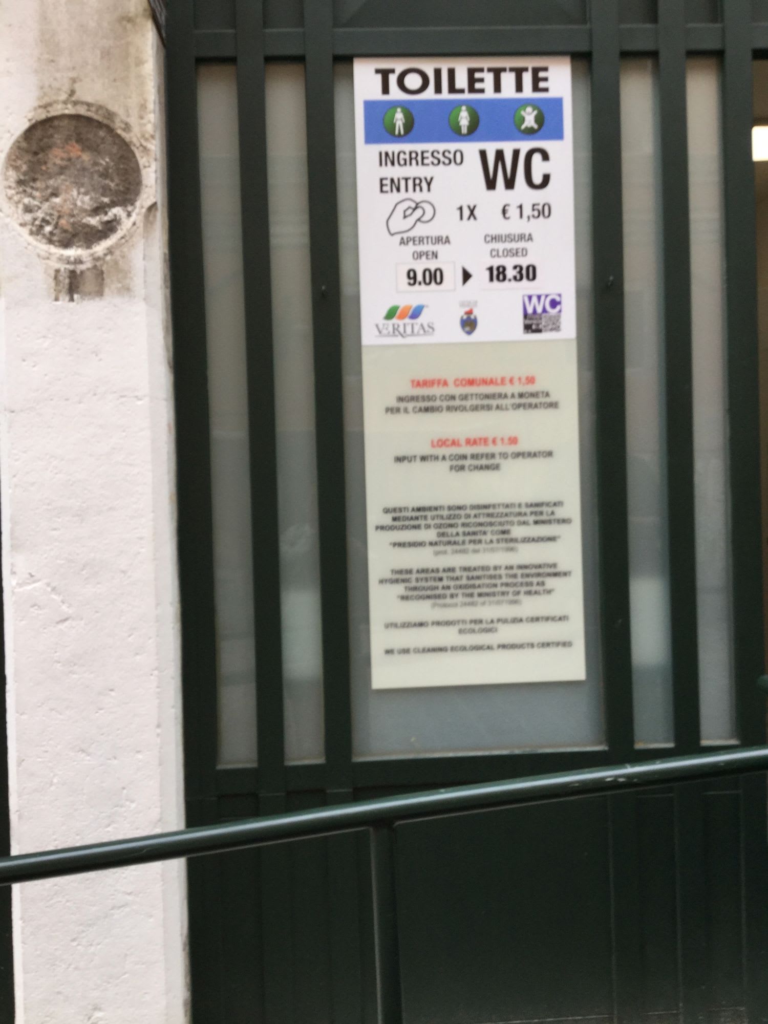 今回のクルーズの途中に、久し振りに訪問したヴェネチアの街でトイレを色々な所で利用したので、その一部を紹介します。ヴェネチアはショップ、ホテル、レストランは多くあるが比較的小さく個人経営が多く、トイレを一般に開放している所は少ない。有料トイレがあるが1.5EURもする。そこでヴェネチアのトイレ事情と賢いトイレの利用法をいくつか紹介します。