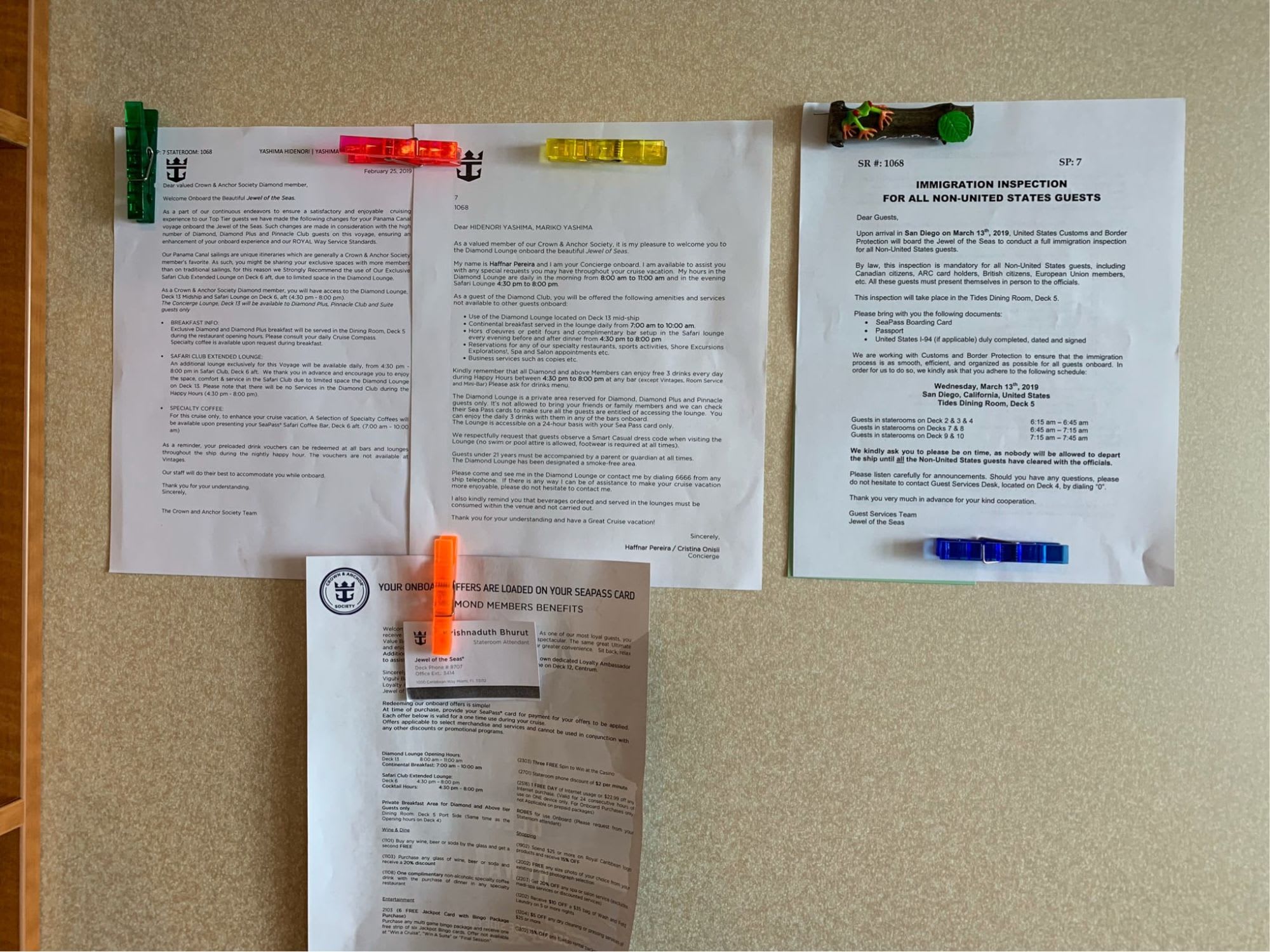 このネームタグは大人気ですね。 ターミナルでよく見かけます。 船内新聞等は私はクリアポケットファイルに日付ごとに分けて収納しています。 1回のクルーズ旅行が終わると1冊終了。 日程表、Eticket控、ホテル予約控を入れ、日ごとにコンパスが増えていき、最後のポケットにはクルーズ中1枚だけ記念に買う写真とポストカードとシーパスカードを入れて旅の思い出にしています。 皆さんのクルーズライフならではのアイデアの交換はためになりますね~