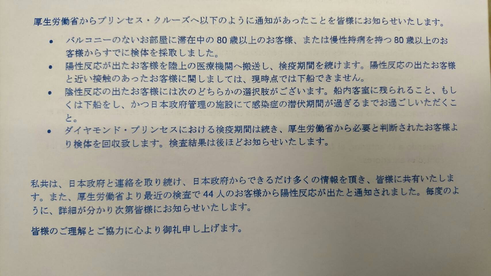渦中のダイヤモンドプリンセスから (2月14日の配布物や食事など)