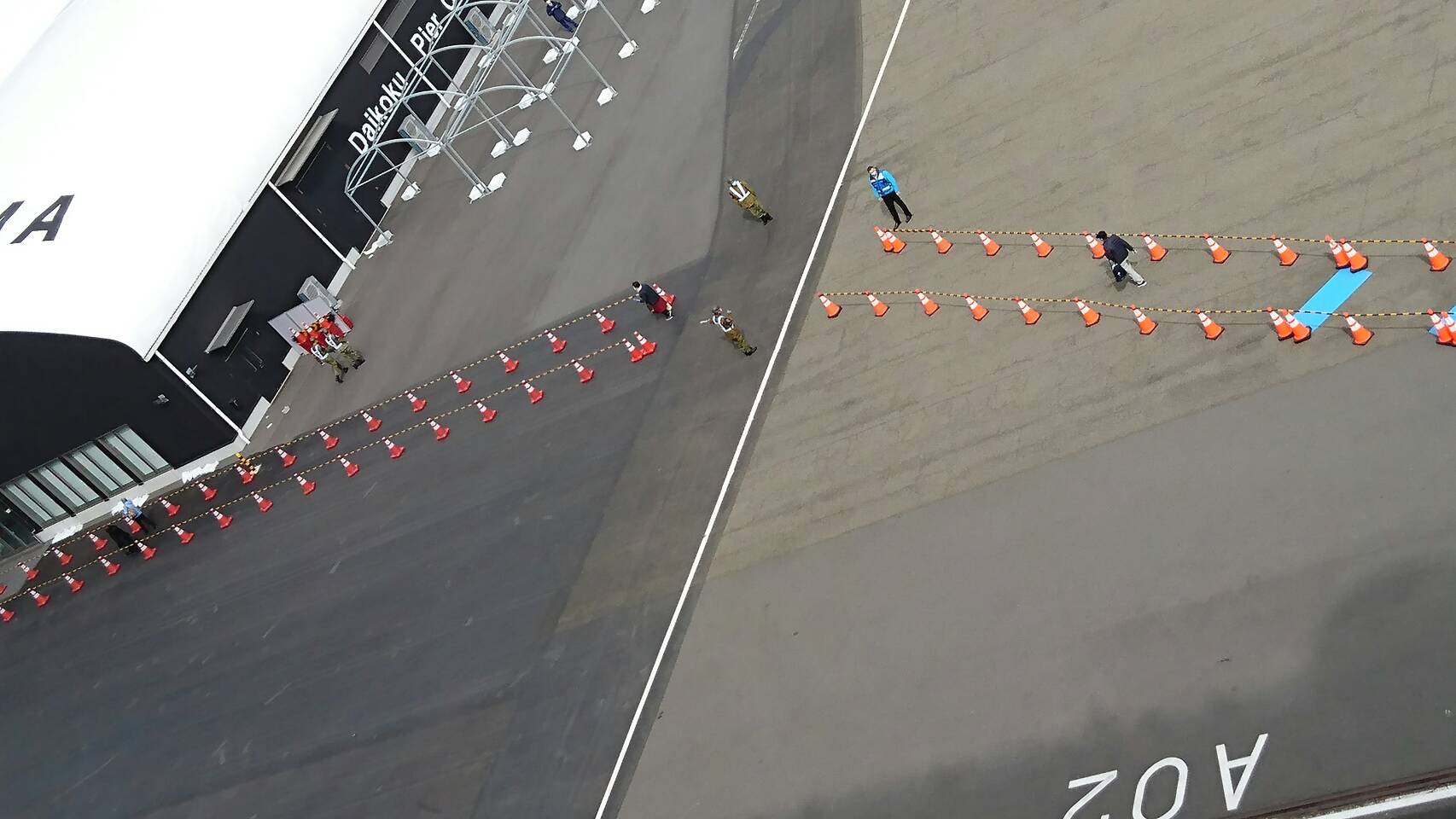 岸壁を見ると区域に下船者の通る道をコーンを並べて表示している。作業者は防護服姿。我々は、まだ、擬似感染者扱い!?