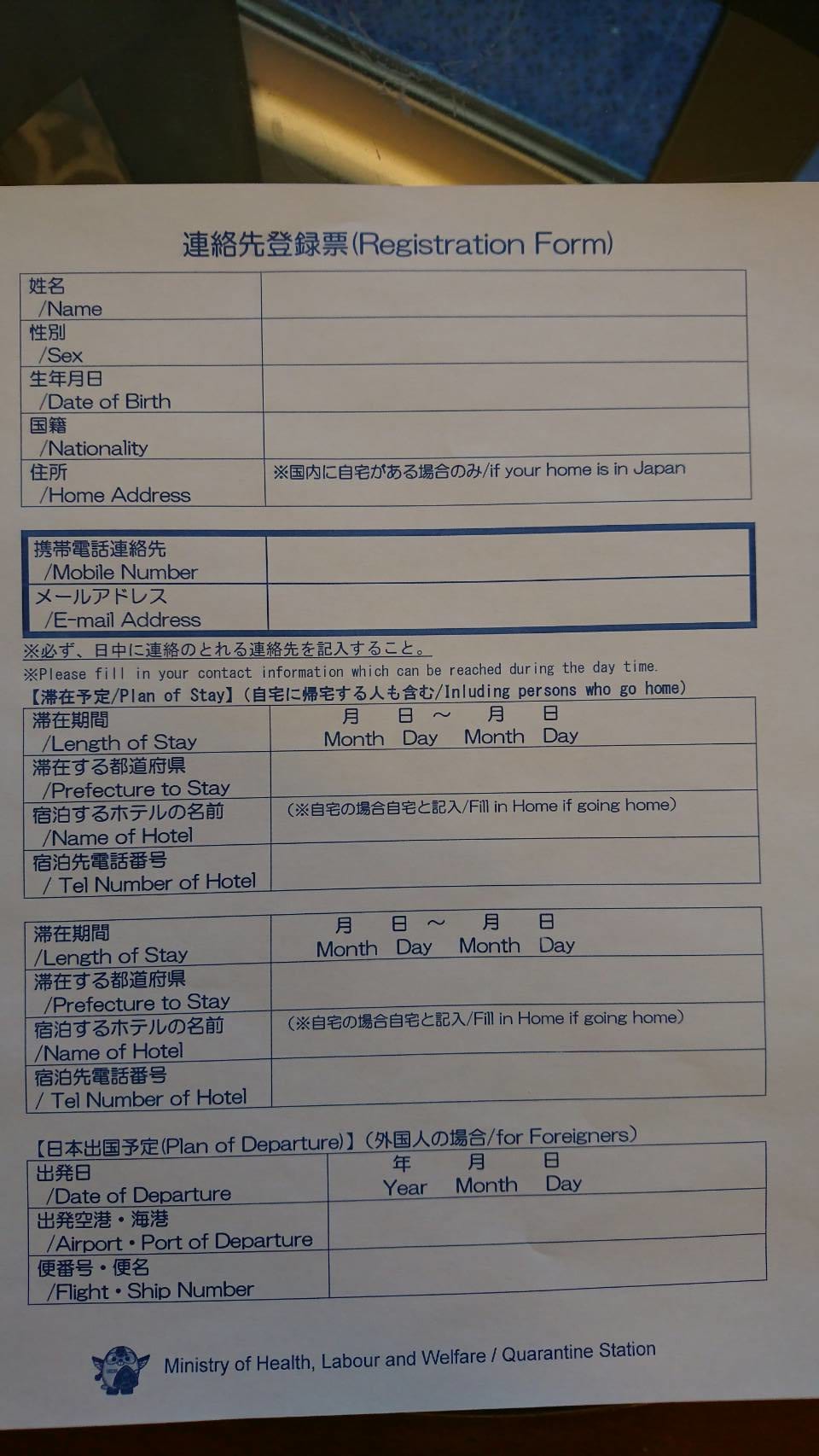 「連絡先登録票」記入、帰宅後の連絡先の記入。