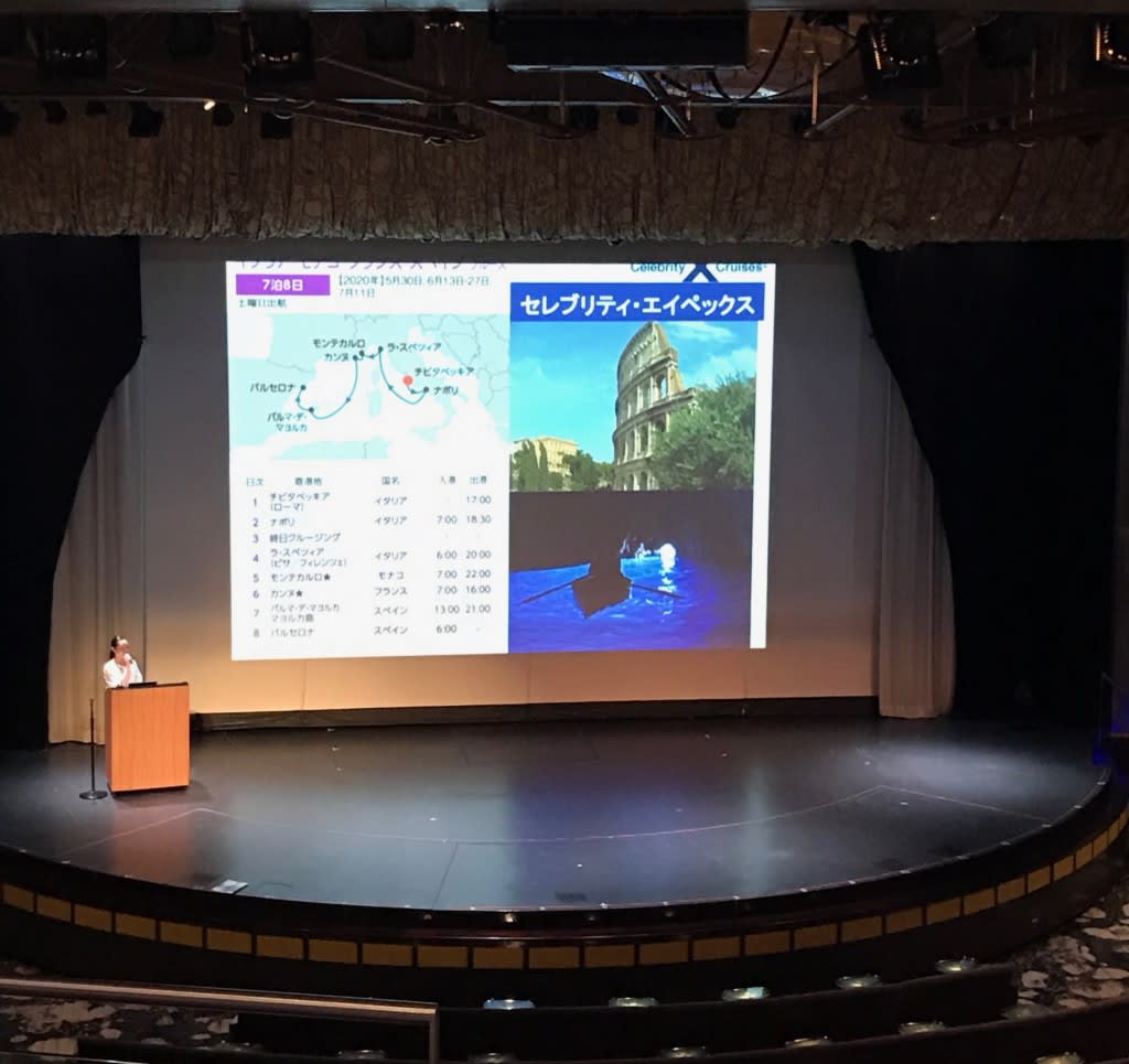 船首には3層吹き抜けのシアター「ザ・シアター」。毎夜様々なショーがある他、昼間にはセレブリティクルーズのクルーズ紹介などもありました。