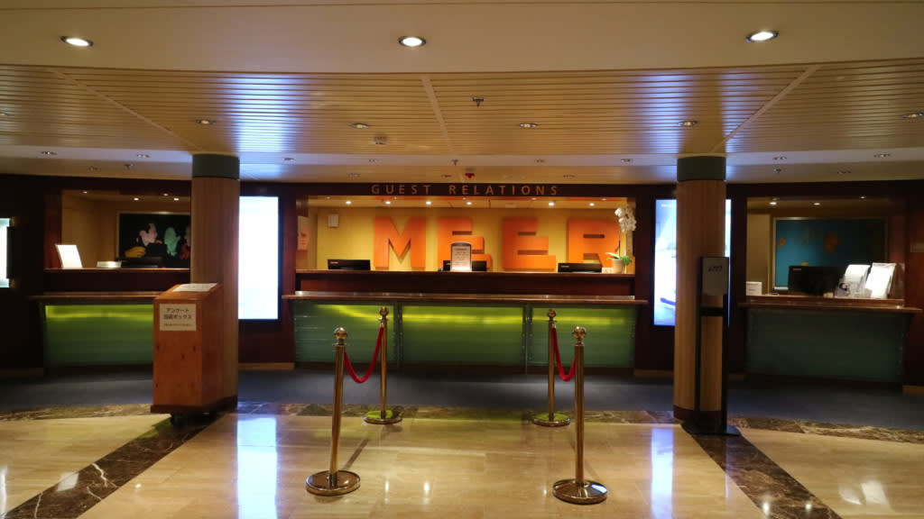 プラザデッキ3F(デッキ3)はゲストリレーションズや寄港地観光デスクなどインフォメーション関係が集まっていて、各箇所に常時スタッフがいる状態であまり「再度出直し」ということがなく安心感がありました。特に初めての「ひとりクルーズ」だったの同じフロアに客室があったことは何より心強かったです。