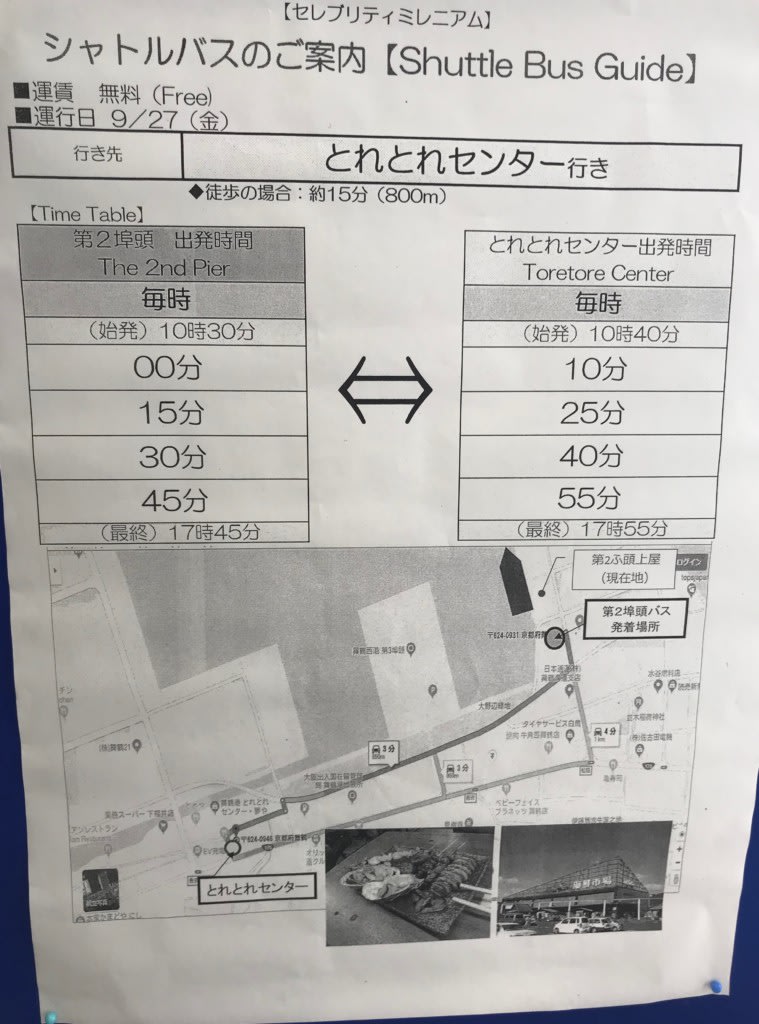 セレブリティ・ミレニアムを下船して「西舞鶴駅」「とれとれセンター」行きのシャトルバスが出ていました。