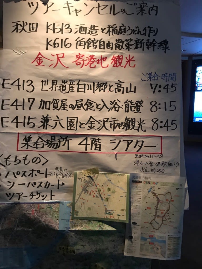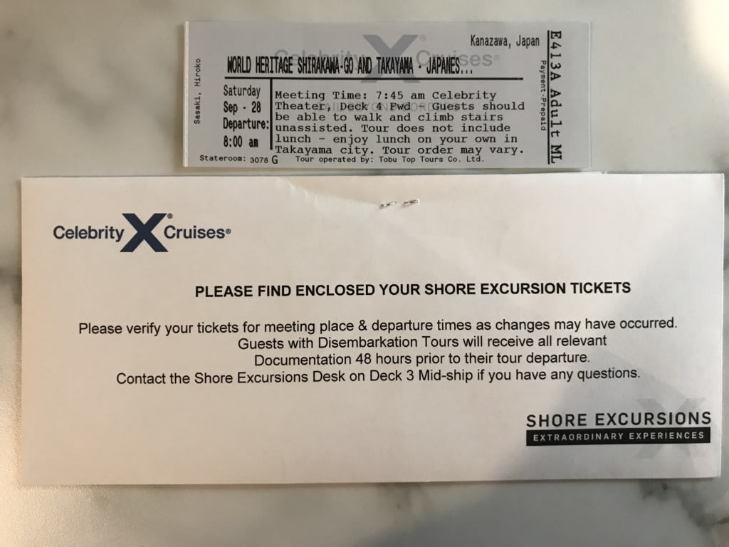 客室に届けられたエクスカーション(寄港地観光ツアー)のチケット。金沢に寄港するのに、私は飛騨高山&白川郷の観光に出かけます!