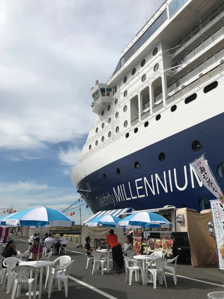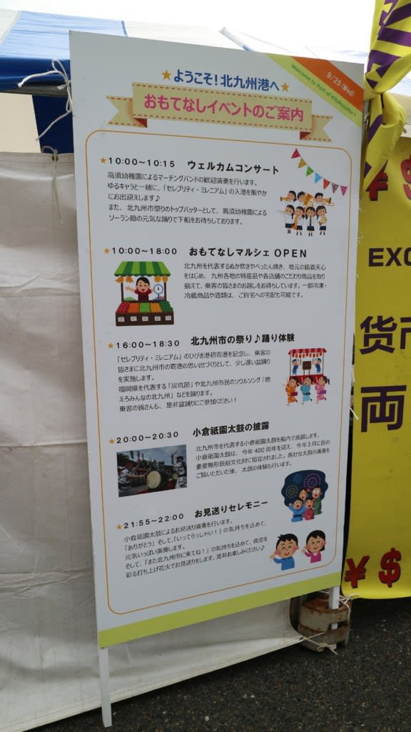 この日は到着すると何やらお祭り…盆踊りのような櫓もありました。10:00の入港から22:00の出港までおもてなしイベントがあったようです。16:00からは盆踊り体験があったんですね。入港から出港までのイベント、熱いおもてなしです。