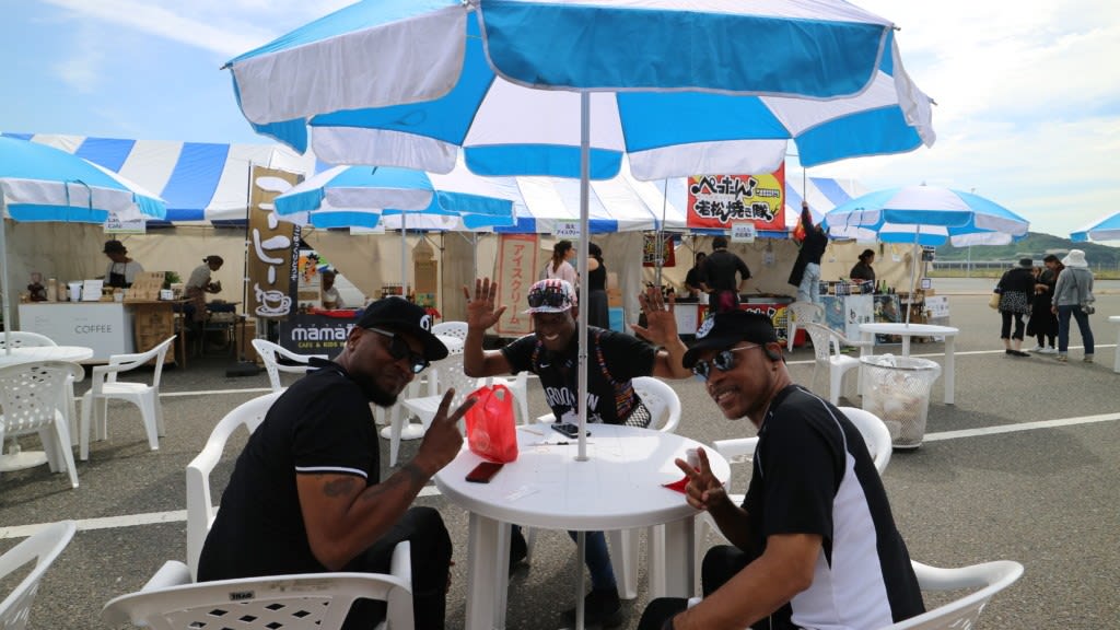 屋台前でくつろいでいるクルーや関係者、乗船客の人たち。写真を撮っていると「オレたちを撮ってくれよ!」と写真要求(笑)。この日ものすごくいいお天気で乾いた風が吹き抜けていて寛ぐには最高な日和でした。