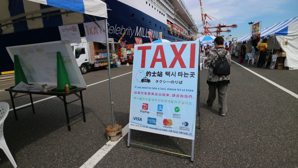 ゲート近くにはエクスカーションの案内板。もう出てしまった後ですが、その付近にはタクシーが常時待機していました。タクシーは電子決済、クレジットカード決済など支払い方法が充実。