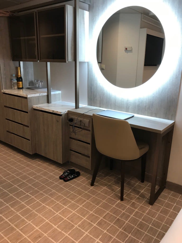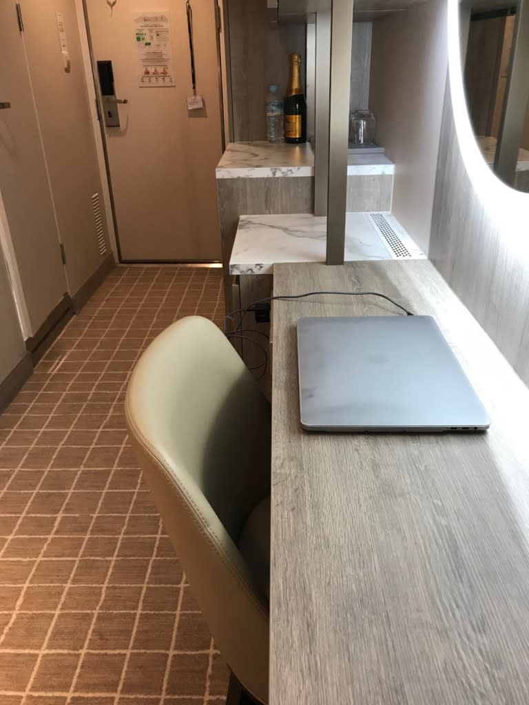 セレブリティ・ミレニアムでは『延長コードの使用は禁止』とクルーズガイドに記載されており、クルーズ経験で初めてのことだったので「コンセント足りるかな」と心配でしたが室内にはたくさん電源を取る箇所がありました。