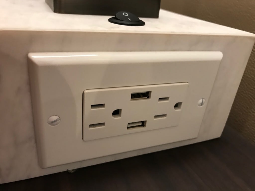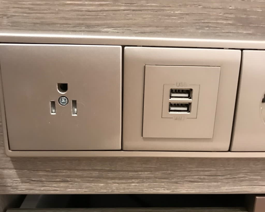 両ベッドサイドのベッドサイドライト台にUSB2口、コンセント2口あります。コンセントは日本で使うものはそのまま差し込んで使用OKでした。