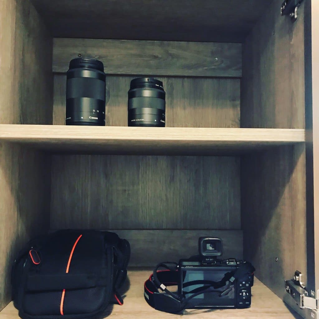 ガラス戸のキャビネットの中にカメラ、カメラレンズ類を贅沢に(?)収納。レンズを探さなくてよかったです。