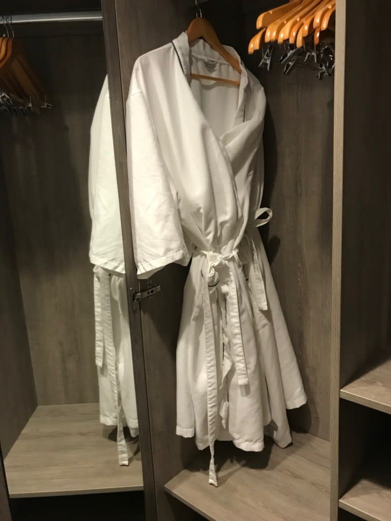 バスロープは一般的な厚いタオル地のものではなくごくごく薄い生地でした。室内で少し肌寒い時に羽織流のに最適。