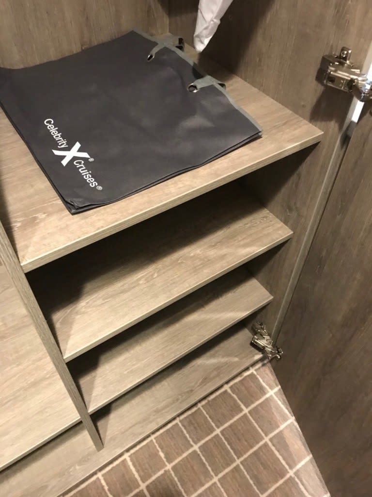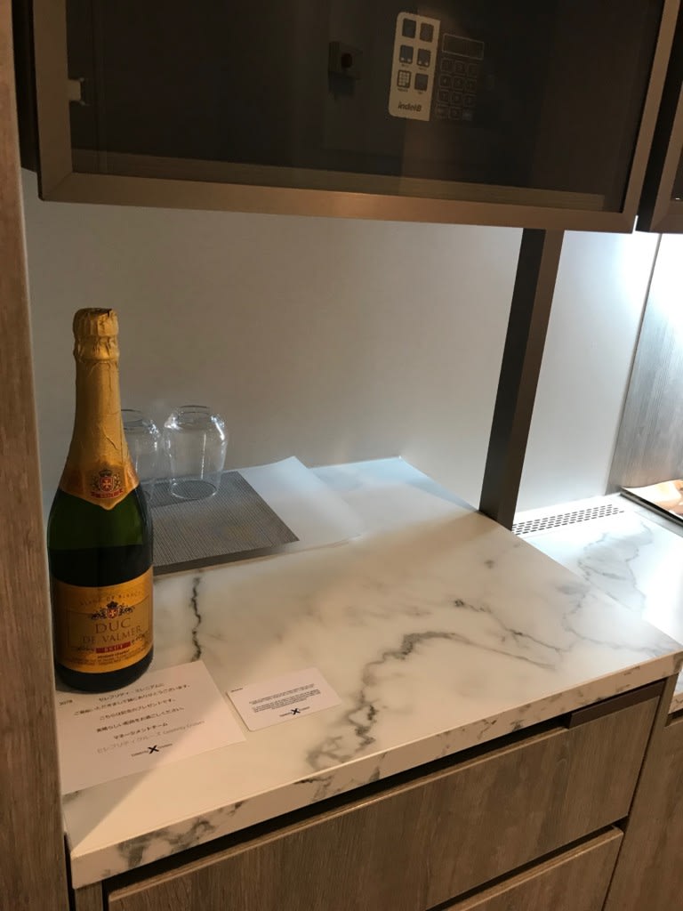 保冷庫横に引き出し収納、その上にグラス類。その上はガラスの戸棚、その中に金庫が収納されていました。シャンパン一本はセレブリティクルーズからのプレゼント!!