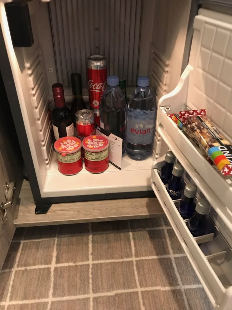 デスク横の腰棚を開けると冷蔵庫が。ですが、冷えていません。『保冷庫』という説明がありましたが保冷にもなってなかったような…。中身の飲食物は有料です。