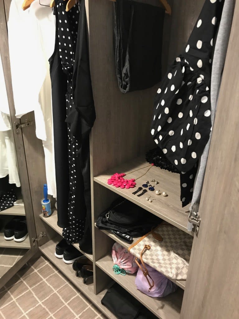 反対側には長い衣類を掛ける収納、クローゼットの扉の内側に姿見がありました。一番下に一段だけの収納があり、そこに靴類を収納していました。