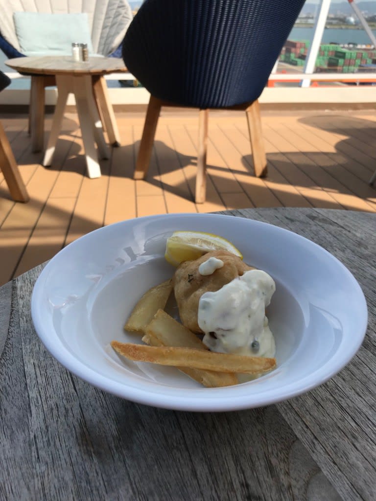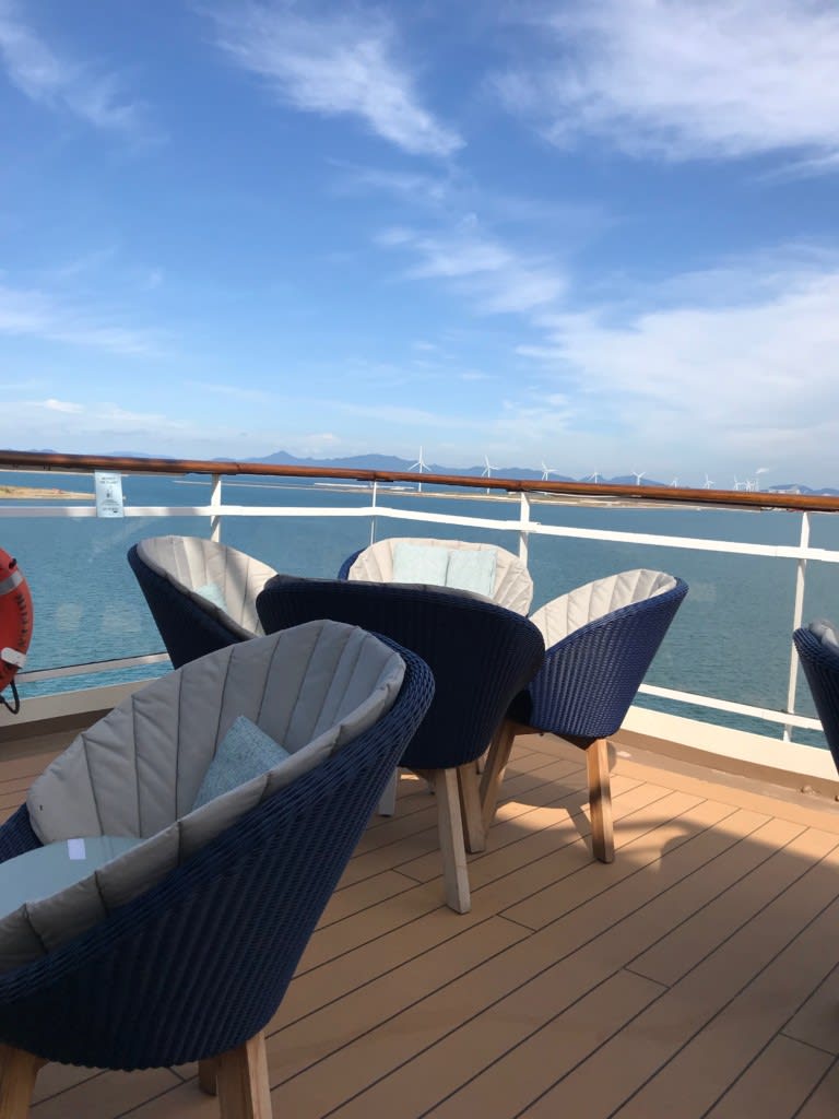 オーシャンビューから続いているデッキ10の船尾にあるサンセットバーでも食事ができ、日が陰っている時は最高の場所でした。