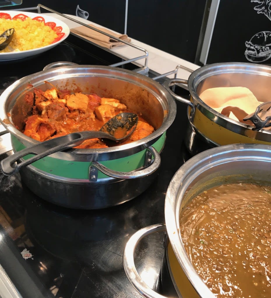 2皿目はインド料理コーナーでカレーを!カレールーはトマトベースなのかサラサラしたスープのような軽いもので、これがいくらでも食べれそうで怖い…。やや薄味。ブッフェにあった一番小さなお皿に盛りました。