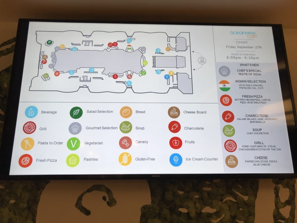オーシャンビューカフェの出入り口にはカフェ内のお料理の配置画像があり、どこに何の料理、フルーツ、デザートがあるのかが一目でわかるようになっていました。「ベジタリアン」「グルテンフリー」などのコーナーもありました。