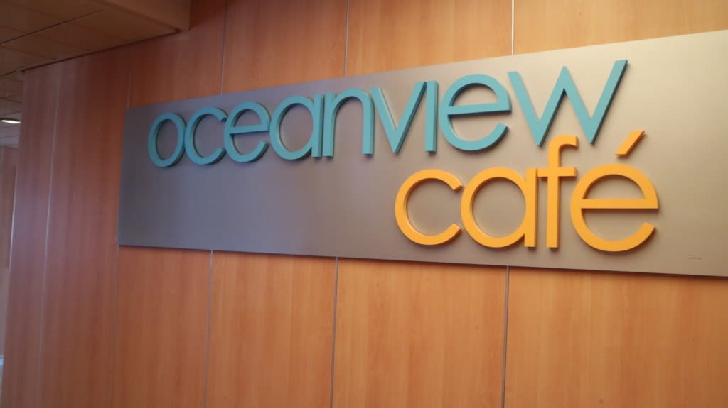 昨年4月に船内見学に訪れた時にもオーシャンビューカフェを見学しましたが、その後の改装によってリニューアルされていました。↑入り口のプレートや壁も変わったいました。(上:現在。下:2018.4当時)