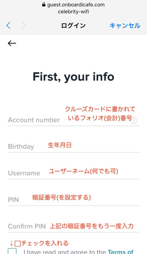 あとは生年月日、ユーザーネーム、暗証番号を決め入力し、最後に⬜︎にチェックを入れます。