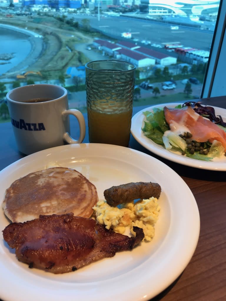 2日目朝食はブッフェレストラン「オーシャンビューカフェ」にて。下船開始予定が7:30からということで7:30過ぎに行ったのにも関わらずほぼ満席。窓際のカウンター席でクルーズターミナル周辺の様子を眺めながらの朝食でした。