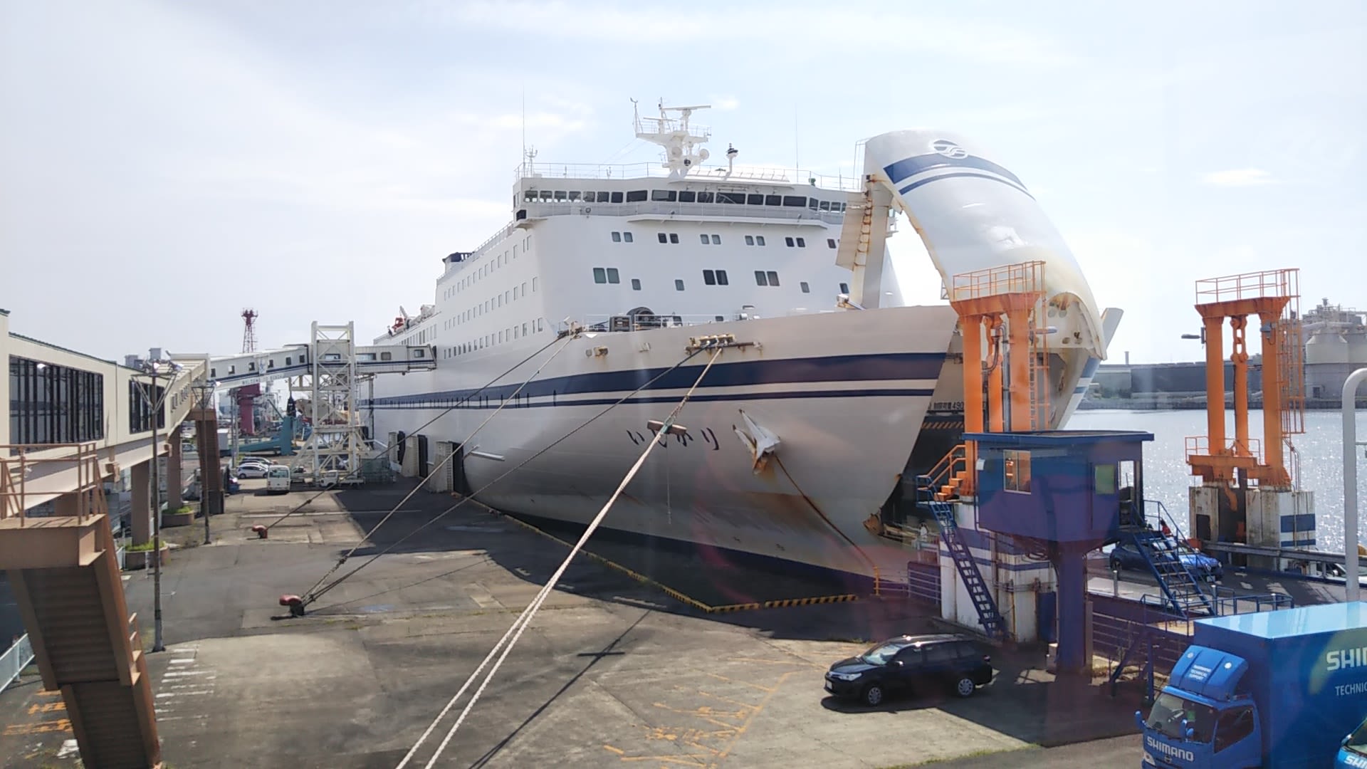 【仙台港着岸中の「いしかり」。苫小牧行きの人でも、仙台では2時間程度の一時下船が可能。徒歩or路線バス圏内にイオンや三井アウトレットパークあり】