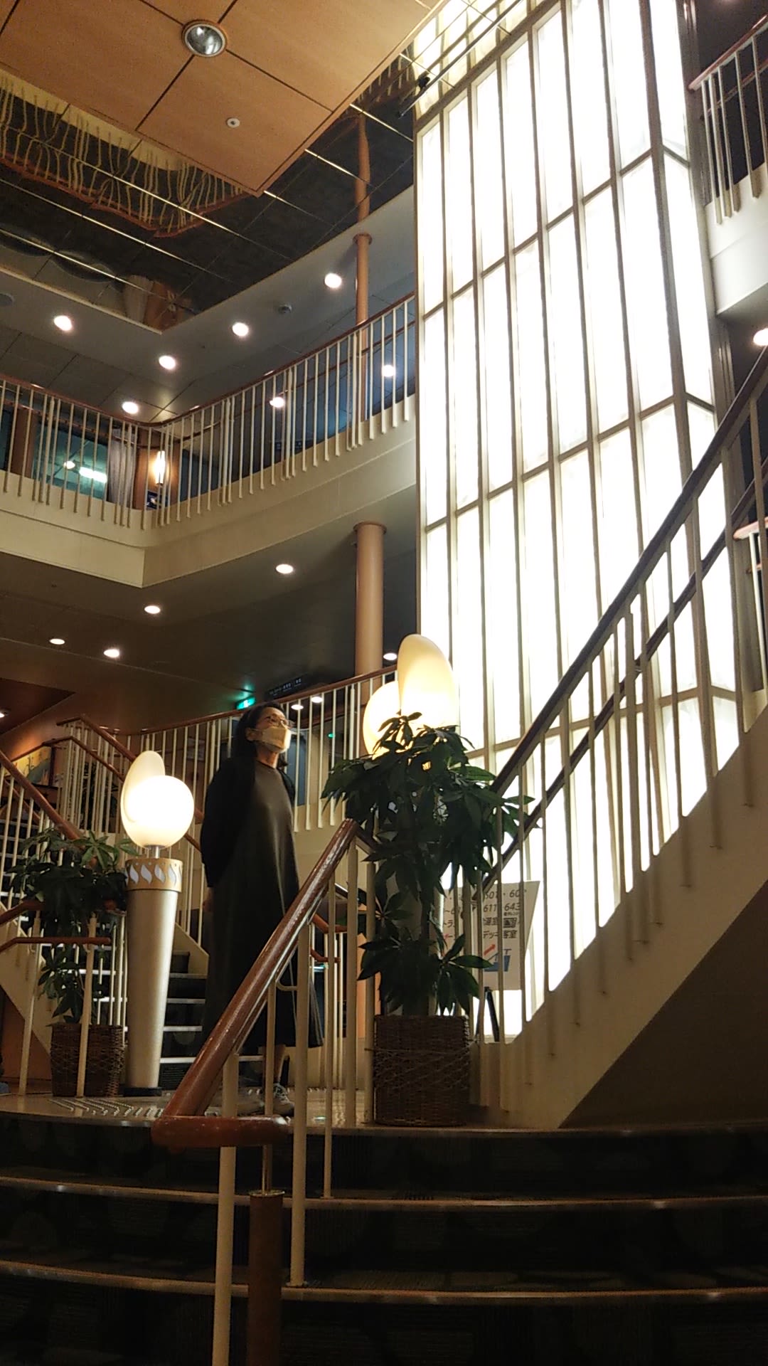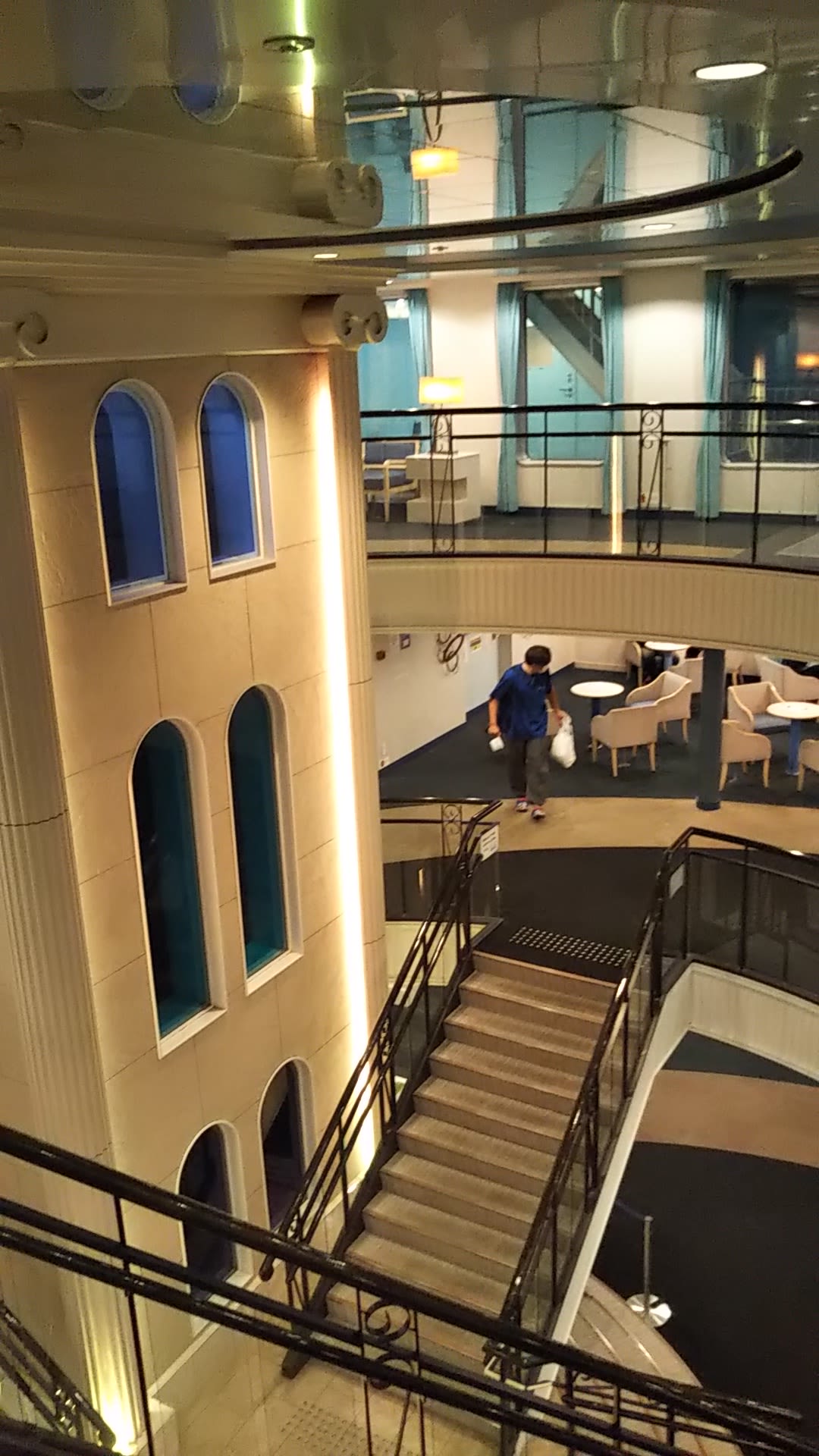 【こちらは「いしかり」の吹き抜け。同型船ですが、「きそ」がシック、「いしかり」がモダンでライトな内装デザインと違いがあり、竣工年の違いを感じます】