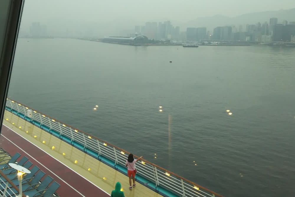 啓徳クルーズターミナルの向こうに見える街並みも霞んでいます。(ノД`)トホホ