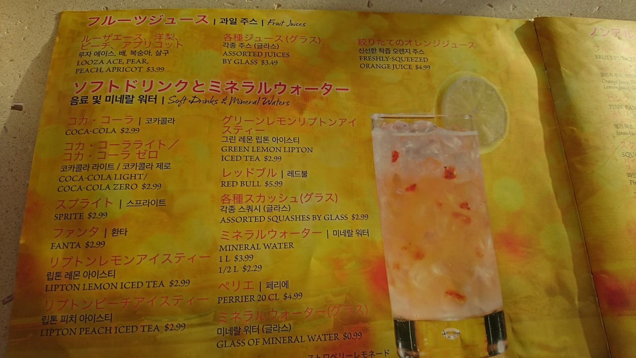 せっかく飲み物飲み放題プランになっているので、ウェルカムドリンク代わりに1杯飲んでみましょうか。バーにいるスタッフはほとんどがアジア系の外国人スタッフなので、日本語はあまり通じませんが、スタッフも日本人に慣れてる感じだったので、英語がしゃべれなくてもメニューを指で指し示せば問題なさそうな感じ。