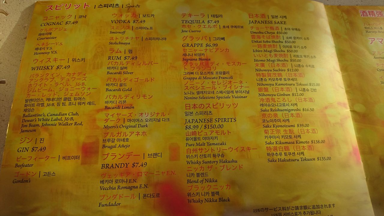 各メニューのお値段に、+15%のサービス料が加算されます。飲み放題プランは「サービス料を加算した後の金額」が12ドル以下のものに対して適用されます。