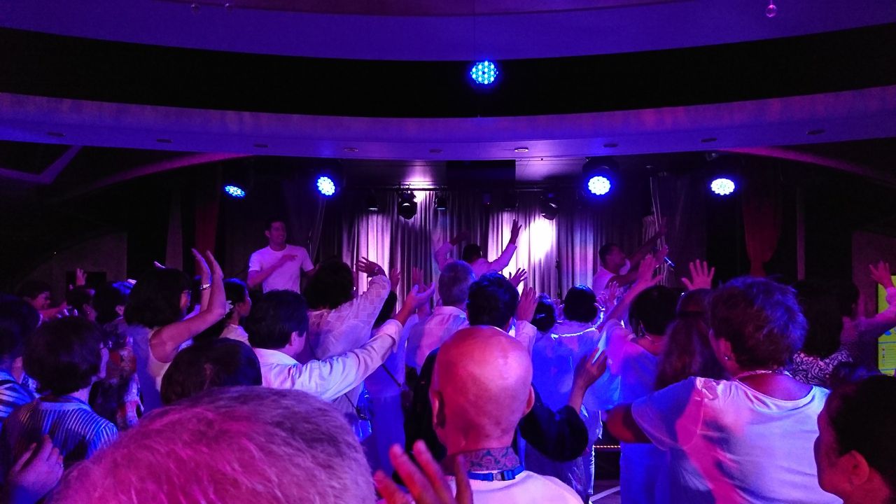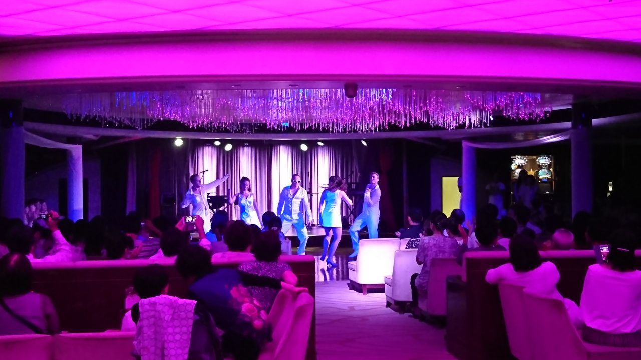 コスタ・ネオロマンチカでは、日毎にテーマナイトを設定していて、舞鶴出港後は「ホワイト・ナイト」つまり、スタッフもお客さんも、なんでもいいから白いものを身につけてパーティーをしましょう!!というイベントでした。まぁ実際のところは、白いものつけてない人もたくさんいましたけどね(笑)