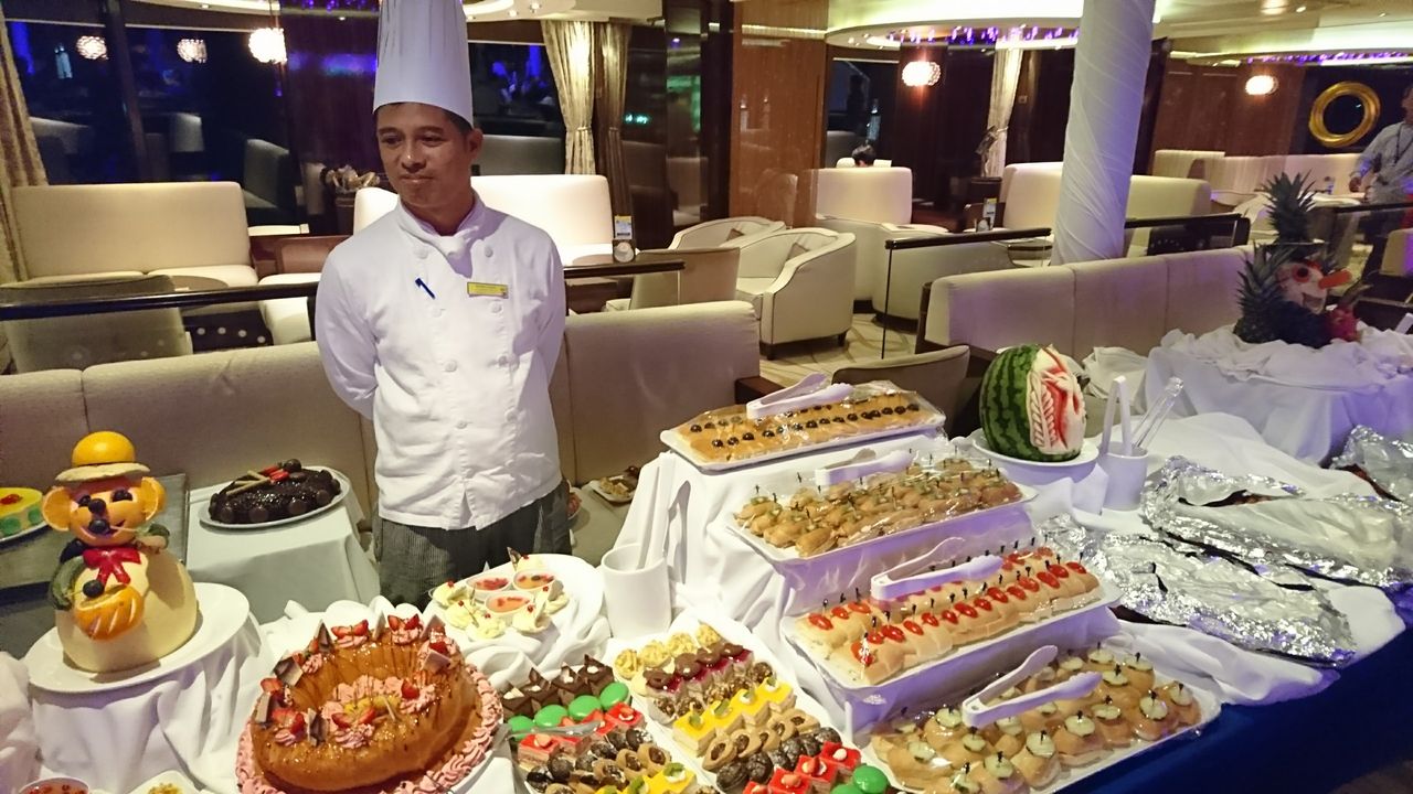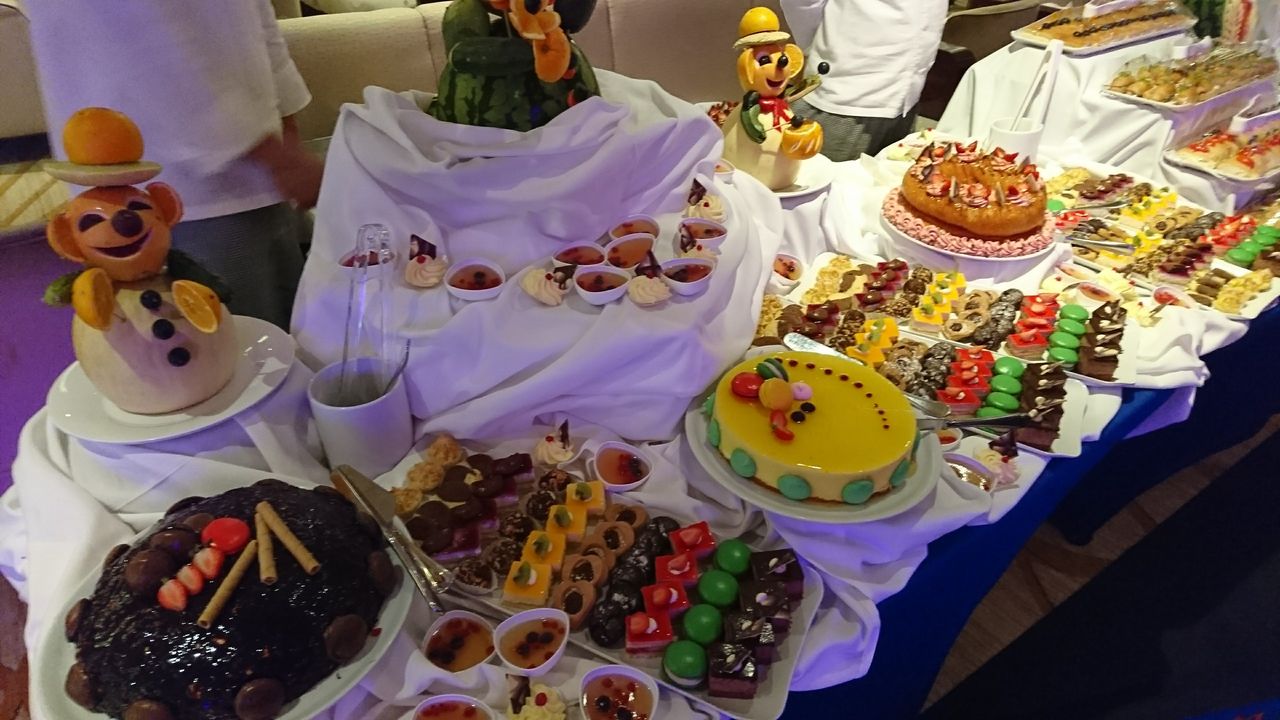 デッキ8の「グランドバー・ピアッツァイタリア」の会場内には、色とりどりのスイーツや軽食が準備されます。勿論、これも無料で提供されます。