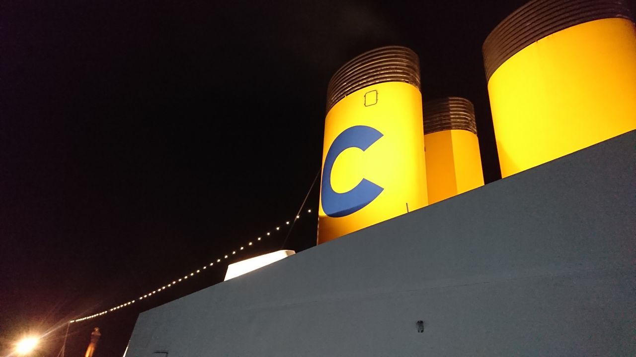 外は既に真っ暗で、コスタ・ネオロマンチカの黄色いファンネルが、漆黒の闇に燦然と輝いています。