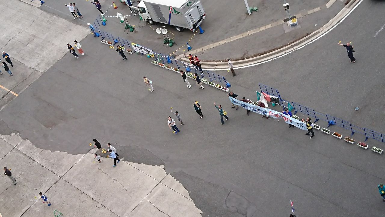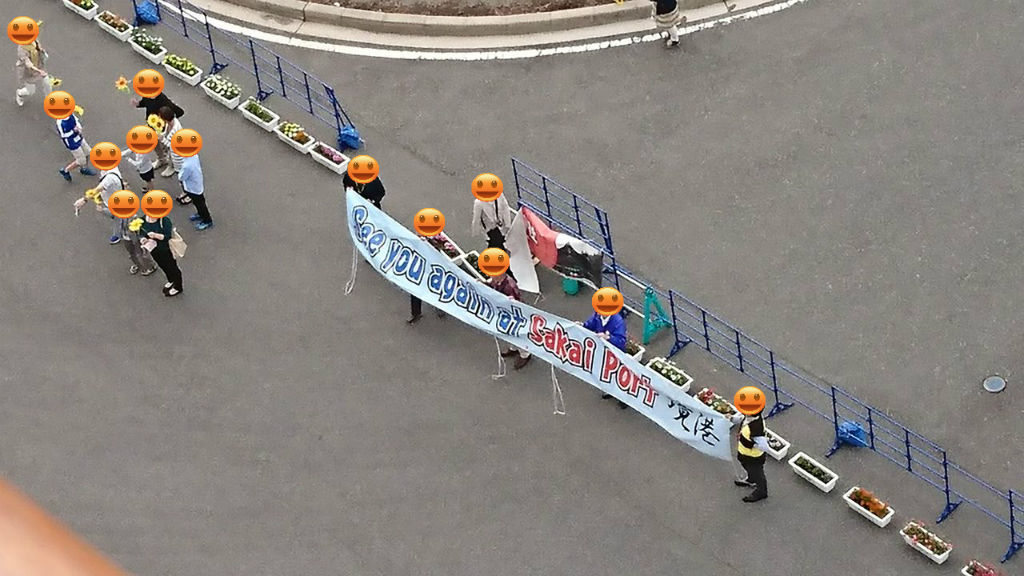 横断幕も掲げられ、いきものがかりの「ありがとう」が流れる中、コスタ・ネオロマンチカはゆっくりと境港を出港していきます。
