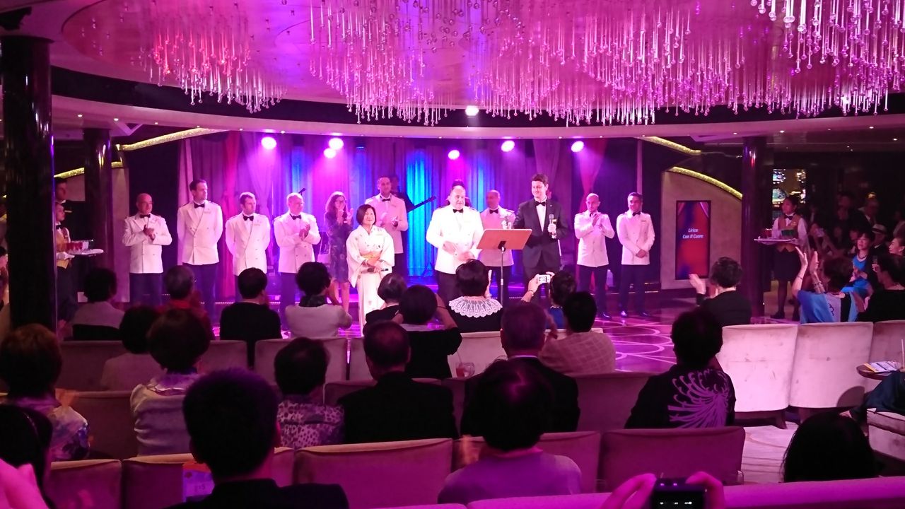 さて、出港した後は、本日のテーマナイトである「ガラ・ナイト」と船長主催のカクテル・パーティーに向かいましょう!!