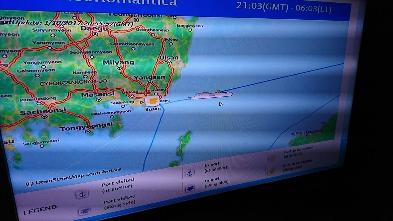 この状態は釜山に入港する直前まで続きましたが、この日以降はここまで揺れることはなかったです。