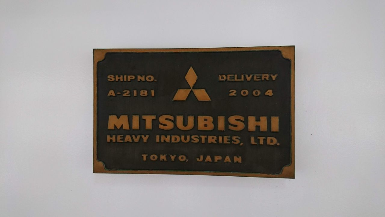 出港の余韻を楽しみながら、デッキを歩いてみると、三菱重工のプレートを発見。