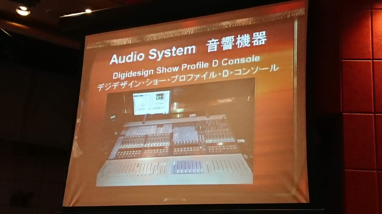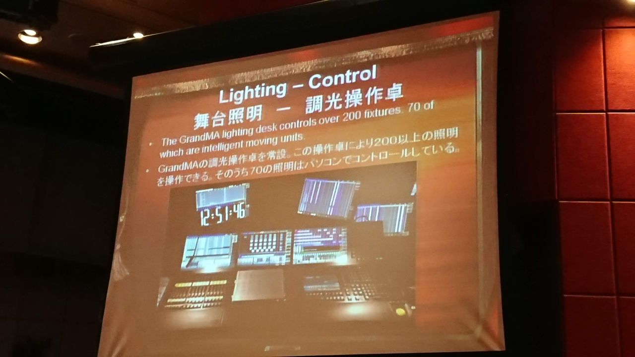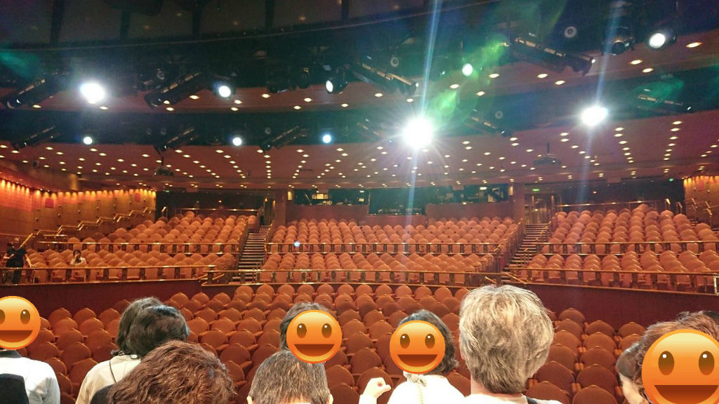 プリンセス・クルーズのアトラクションスタッフと、通訳のためのディレクターのミキコさんが登場。まずは、劇場の舞台装置の解説が始まります。