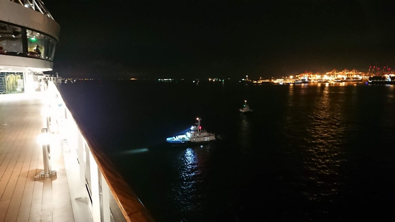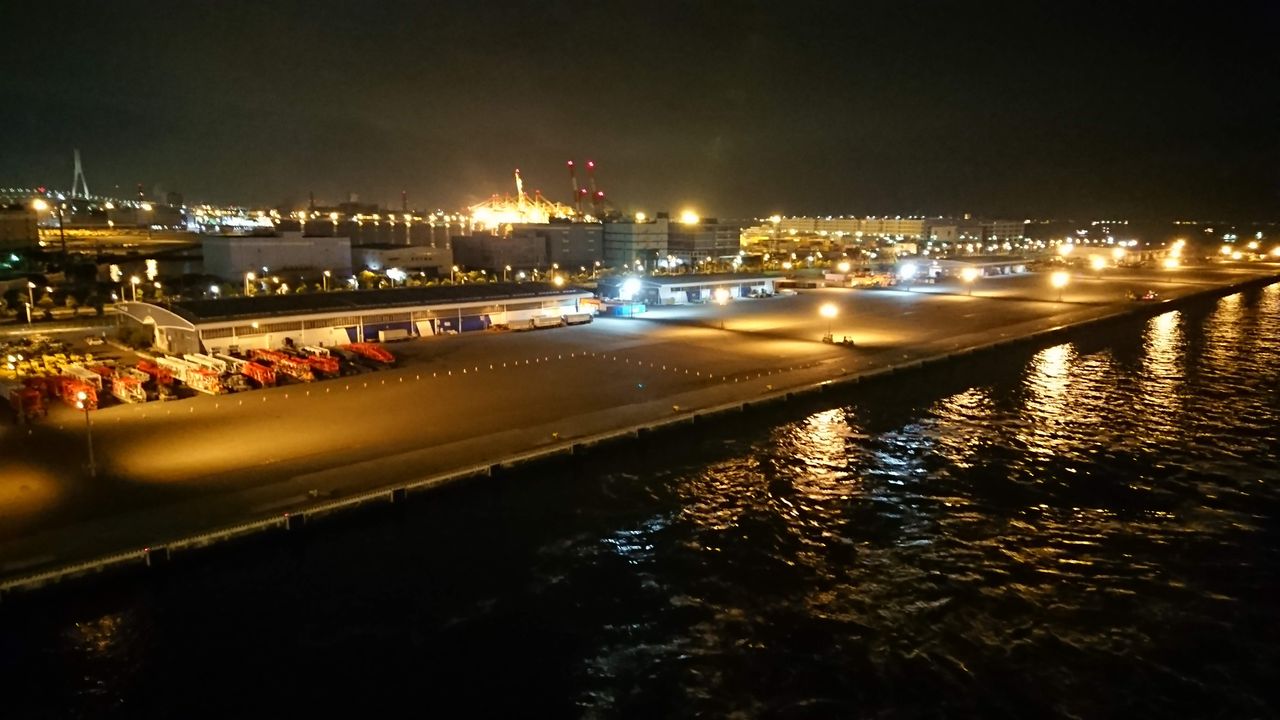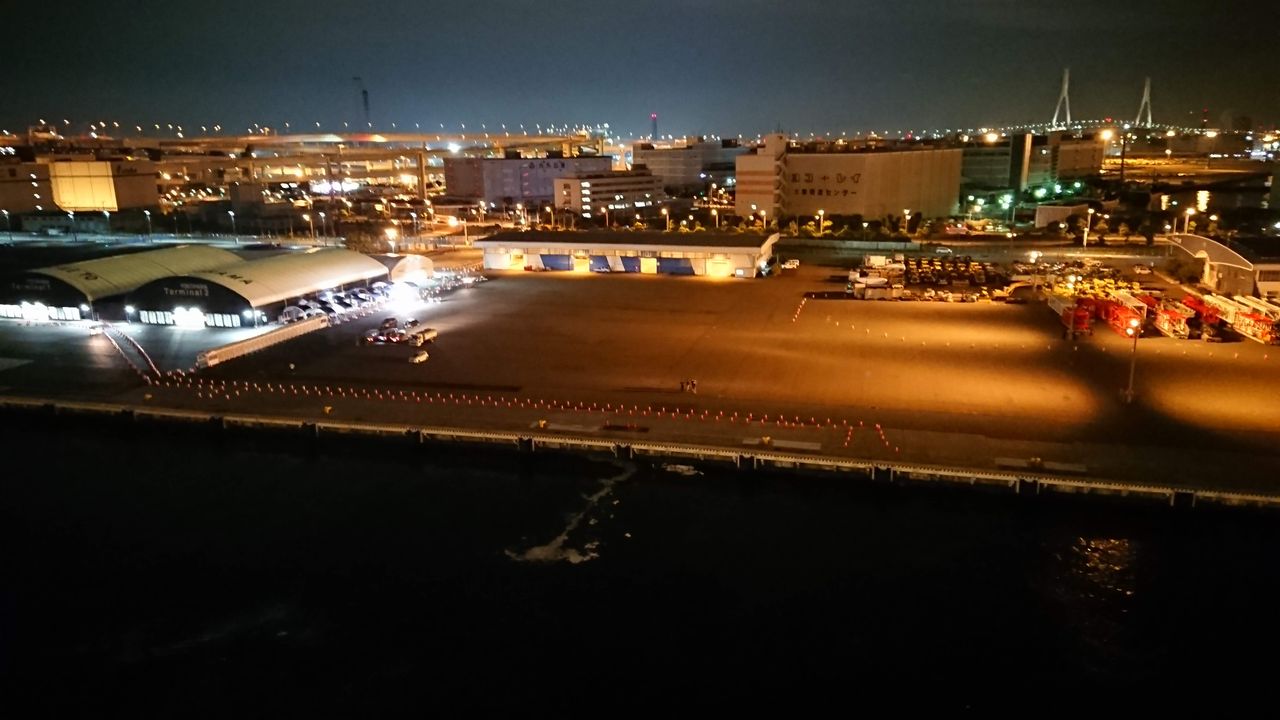 みんなが踊ってはしゃいでいる中、MSCスプレンディダはゆっくりと大黒ふ頭を離岸していきます。今までのクルーズ船でもそうでしたが、巨大な船体からは想像できないほど機敏な旋回ができるんですよ。クルーズスタッフさんの操船能力の高さが垣間見えます。