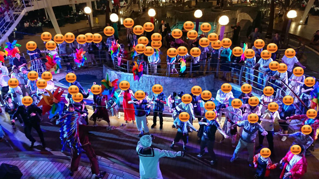 クルーズスタッフのリードに乗って、老いも若きも、日本人も中国人も白人もみんなでレッツダンス!!この出港のときの風景はどのクルーズ船でも共通の景色ですね。
