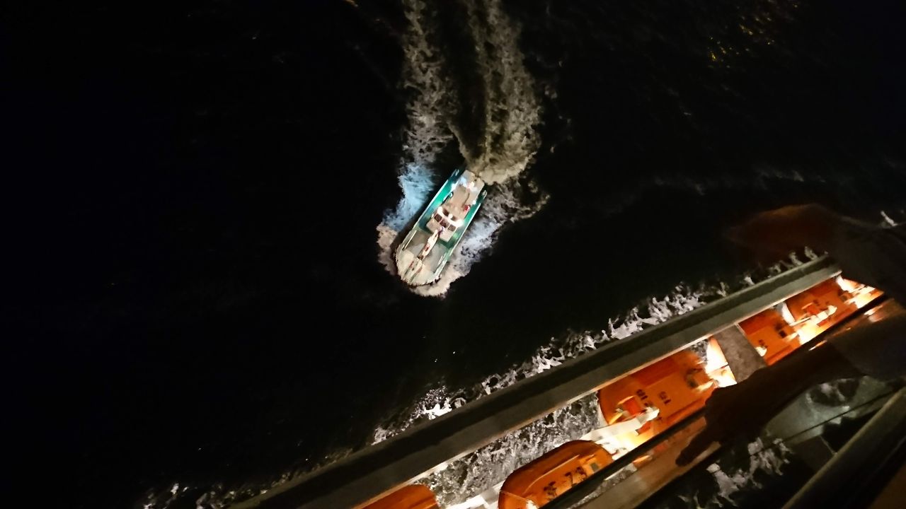 出港からしばらくして、パイロット(水先案内人)を回収に船がやってきます。