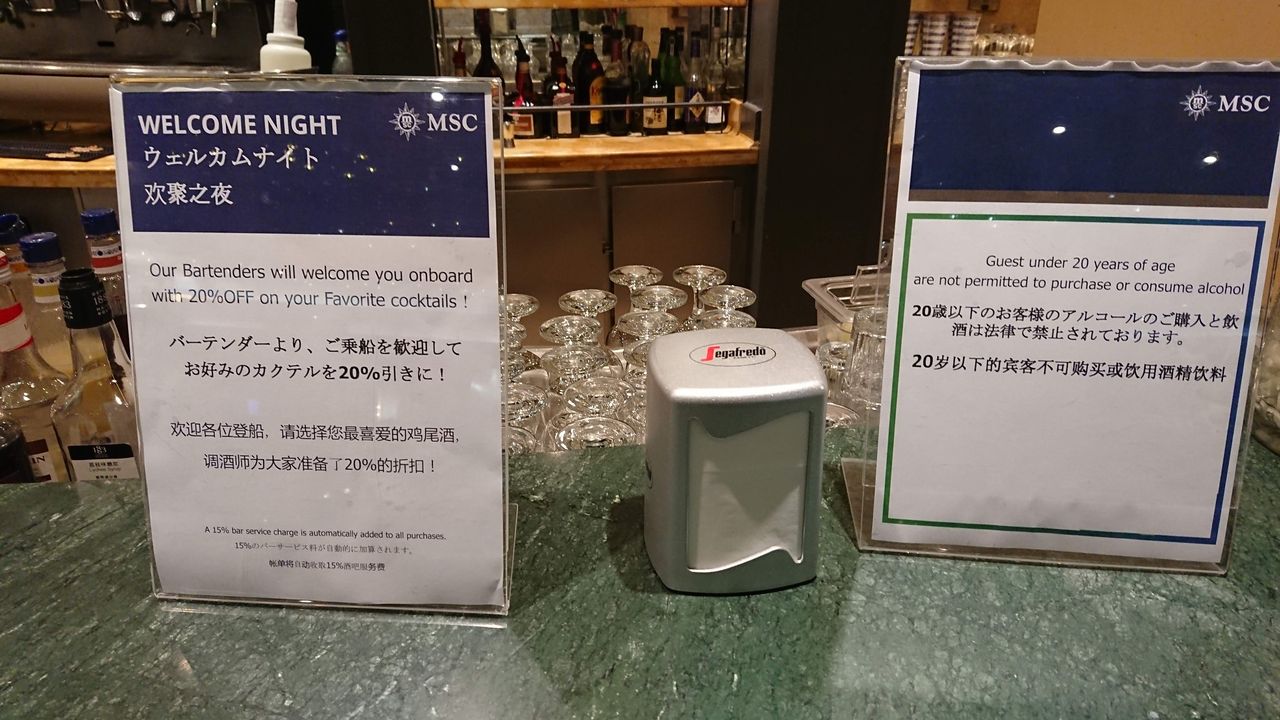 船内に戻ると、お酒は20%OFFのウェルカムセール中!!