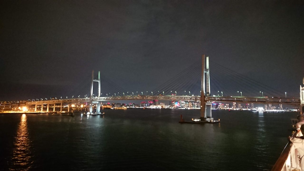 夜の静けさを取り戻したベイブリッジと、その先には横浜の夜景が広がっています。