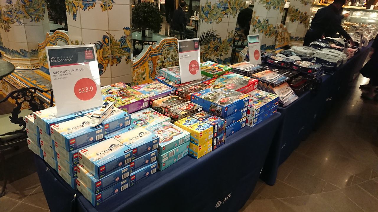 手前の商品はなんとレゴブロックのMSCスプレンディダ。