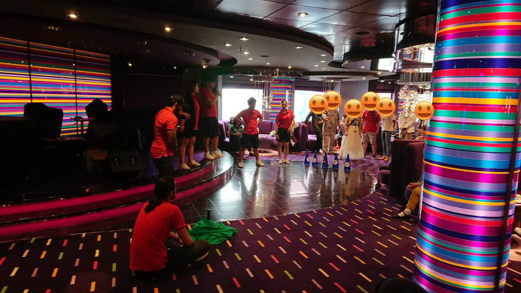 運動を兼ねて船内をぶらぶら歩き回っていると、「パープル・バー」ではゲーム大会が開催されていました。外が雨の場合は屋内開催のようです。