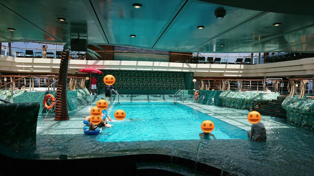 ダイヤモンド・プリンセスは真水(海水かもしれないけどしょっぱくなかった)のプールでしたが、クルーズ船のプールは海水のほうが一般的なんじゃないかと思います。
