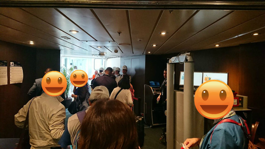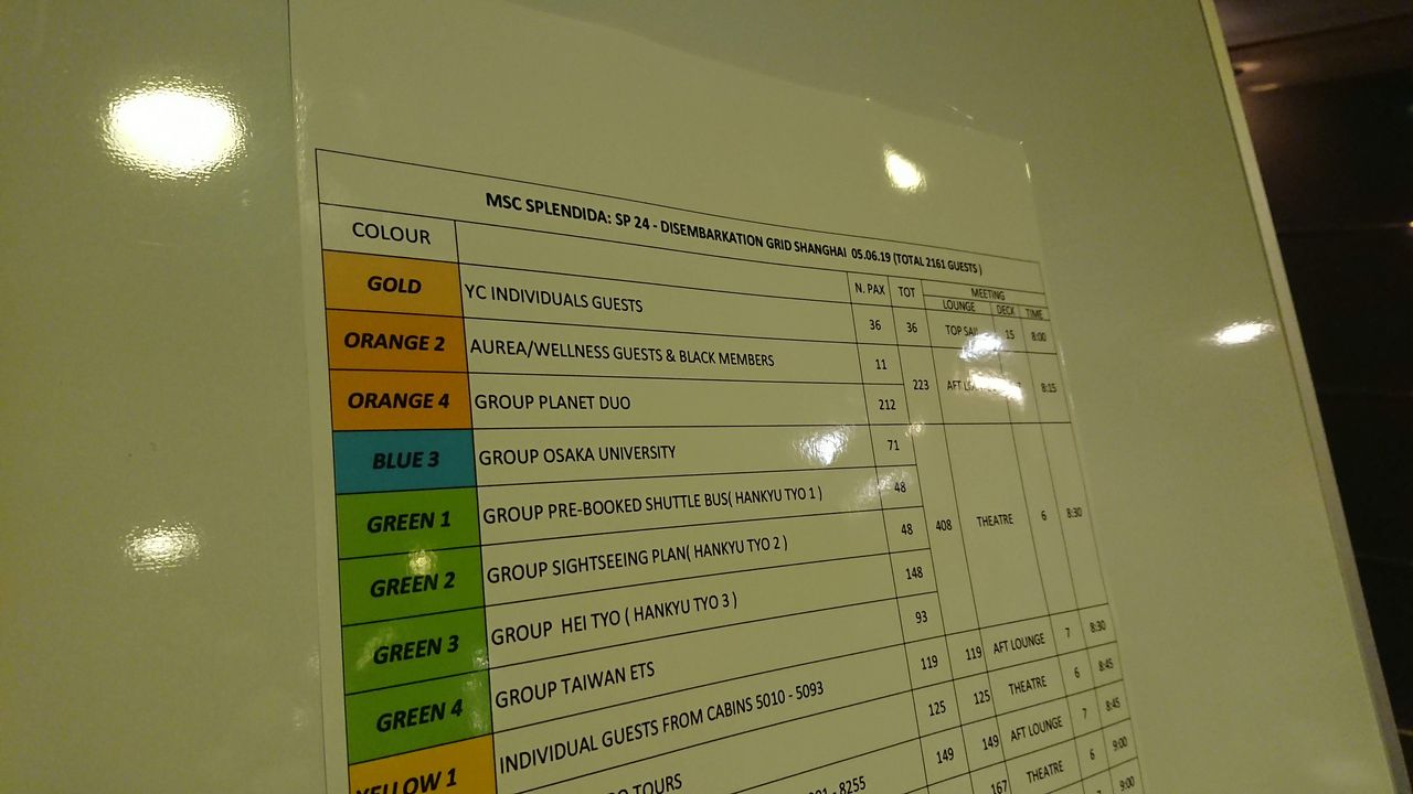 昨日配布された荷物タグの色に従って、下船可能時間が割り振られます。