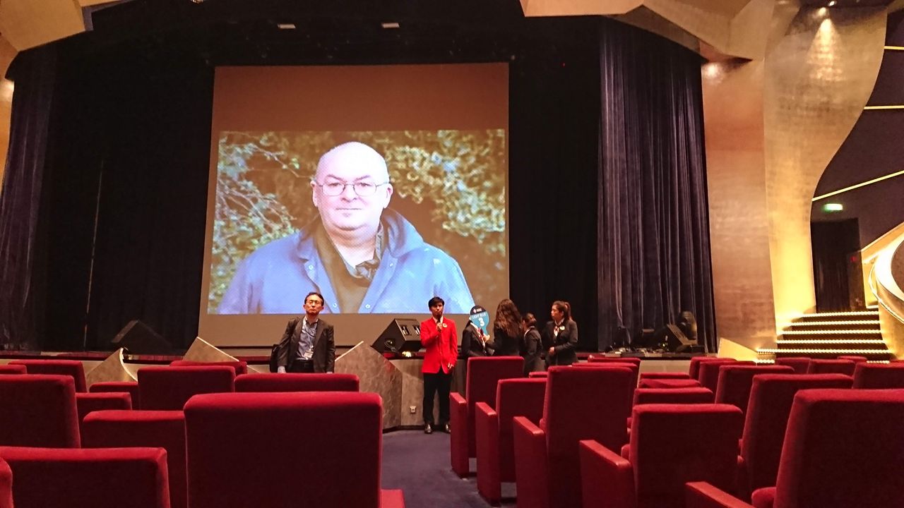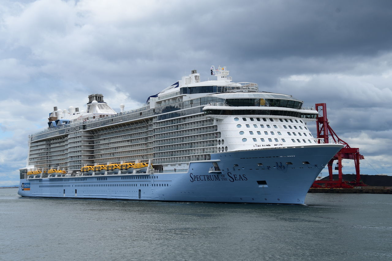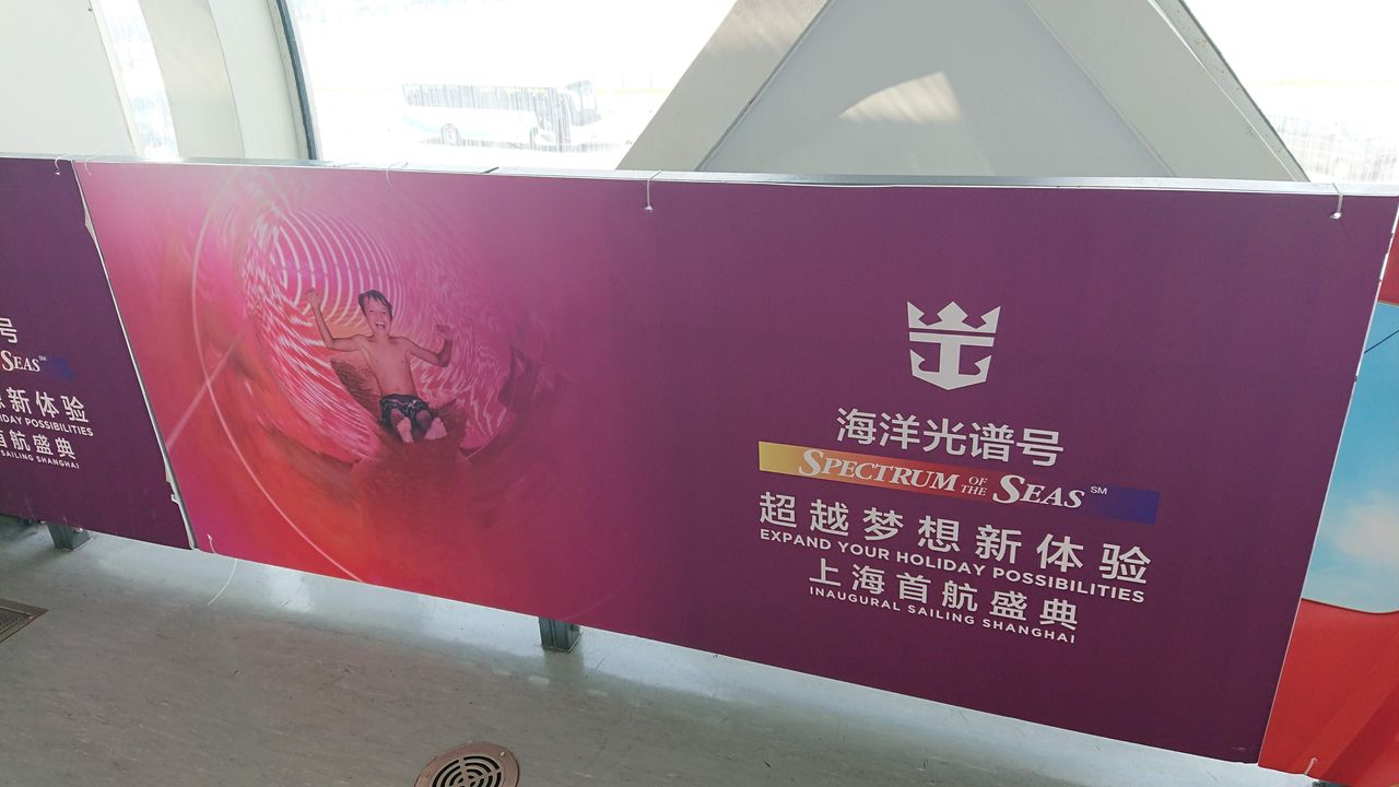 下船通路にはロイヤルカリビアン社が2019年に中国航路に就役させた最新型クルーズ客船「スペクトラム・オブ・ザ・シーズ」の広告が一面に並んでいました。