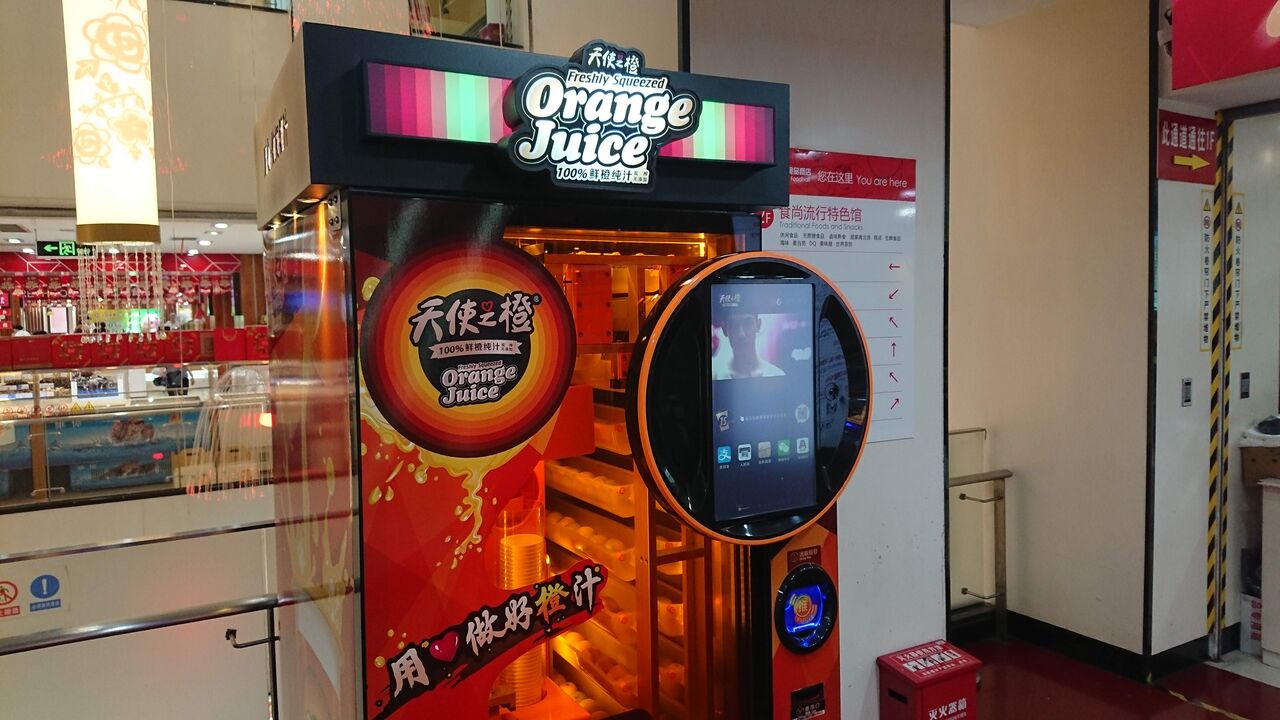 中にはオレンジがいっぱい並んでいて、お金を入れるとその場で絞りたてを出してくれます。