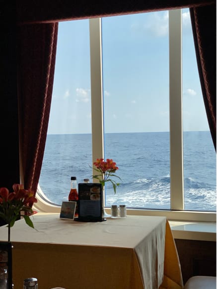 サボイダイニングルーム、窓際の席はこうして海を近くに見ることができるのが良いなぁと思います。(夜は真っ暗でカーテンひいてると思うけど…。)